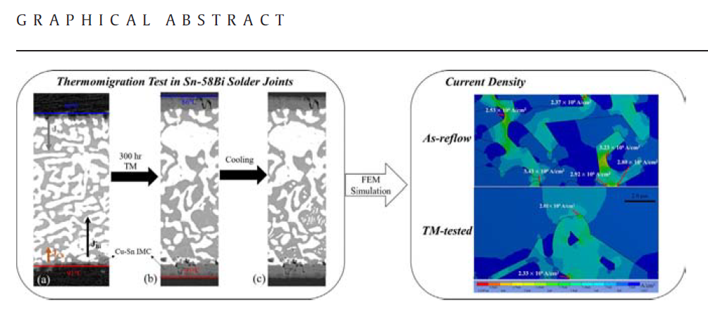 Thermomigration은 Joule heating으로 인한 전자기기의 신뢰성에 있어서 중요한 이슈가 되고 있다. 온도 구배는 늘 생길 수 있고, 단지 1도의 온도 차이가 10μm 두께의 microbump에서는 실제로 큰 효과로 나타날 수 있기 때문에 고려가 필요하다. Eutectic Sn-Bi의 경우는 Bi가 온도 구배의 고온측에서 저온측으로 이동하고, 주요 확산원소로서 역할을 한다. IMC (Intermetallic compound)의 성장에 있어서는 cold end와 hot end 모두 비슷한 수준으로 성장하였고, TM으로 인한 영향이 없었다고 볼 수도 있다. 추가적으로 실제 형성된 미세조직(microstructure)를 이용하여 FEM(Finite-element method)를 이용하여 EM(Electromigration)에 따른 영향, Bi와 Sn의 상분리(phase separation)등을 확인하였다.