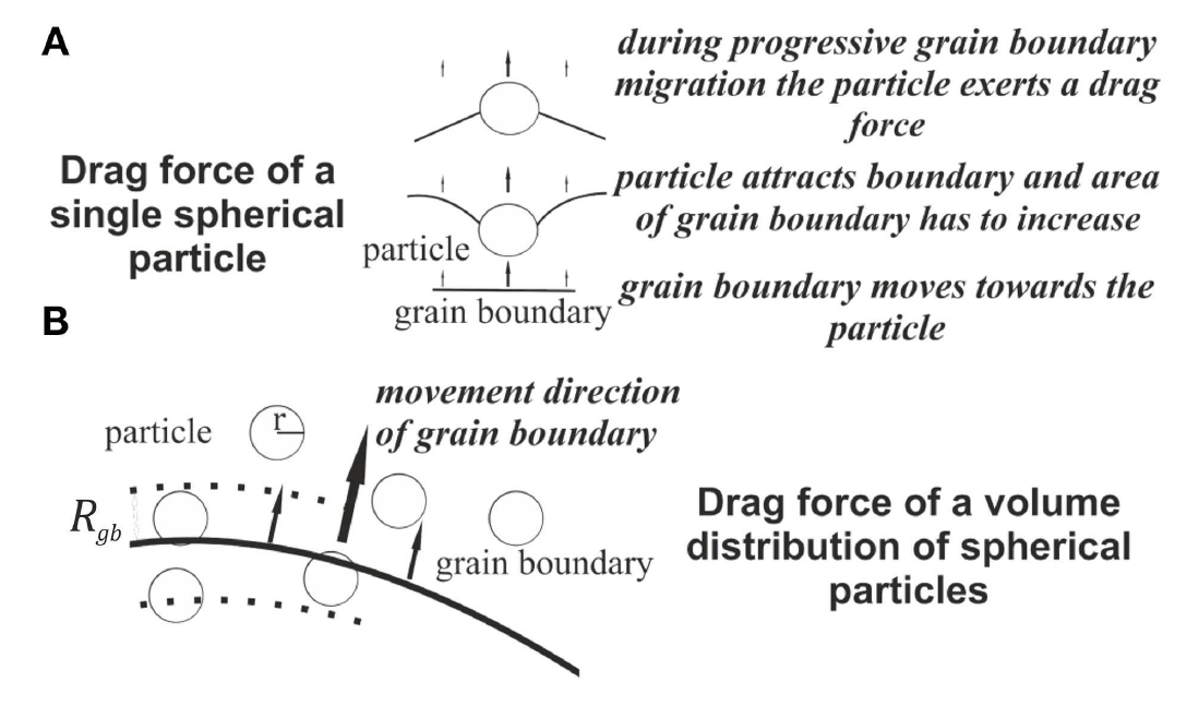 A: Single coherent, spherical particle에 의해 입계에 가해지는 Zener drag의 개념. 입계가 particle을 만나게 되면, 먼저 결정 표면 여기에서는 입계에 상호작용에 의해 attraction force를 가하게 되고, 입계가 이를 뛰어넘어 이동을 계속 하기 위해서는 particle의 크기에 비례하여 그 면적을 증가시켜야 한다. 입계의 이동이 진행되면서, particle은 입계 표면에 대해 drag force를 가하게 된다. 입계의 면적 증가와 drag force은 모두 입계 이동에 대한 추가적인 에너지를 필요로 하게 만든다.